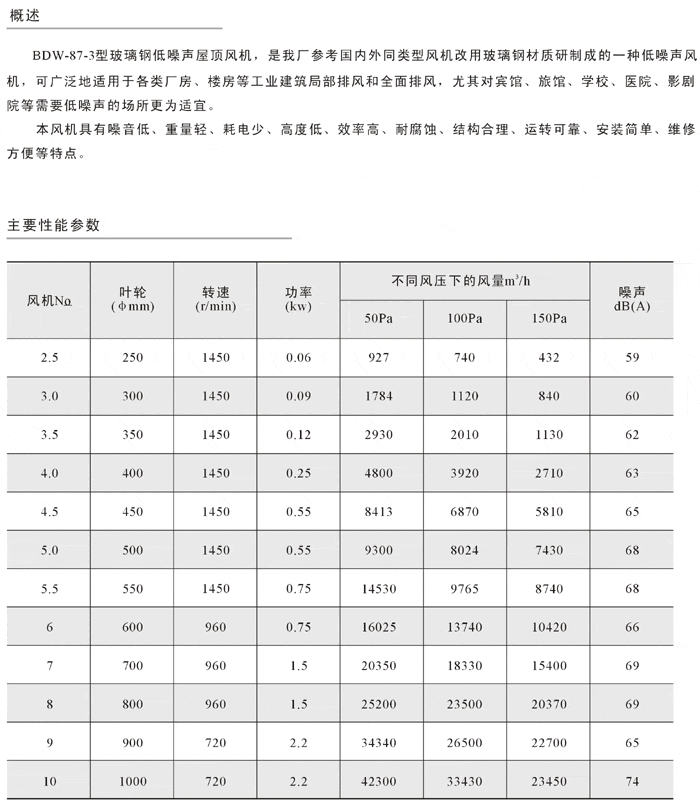 | 產品型號 | BDW-87-3型玻璃鋼低噪聲屋頂軸流風機 |