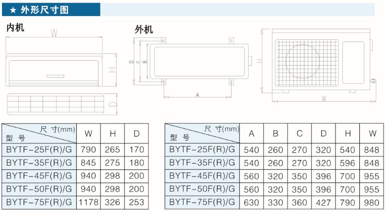 | 室內機外形尺寸 | 790×265×170mm / 845×275×180mm / 940×298×200mm / 1178×326×253mm |